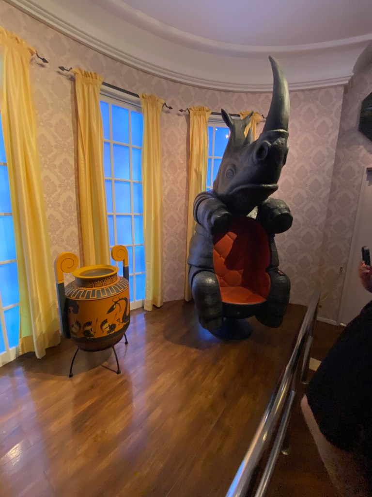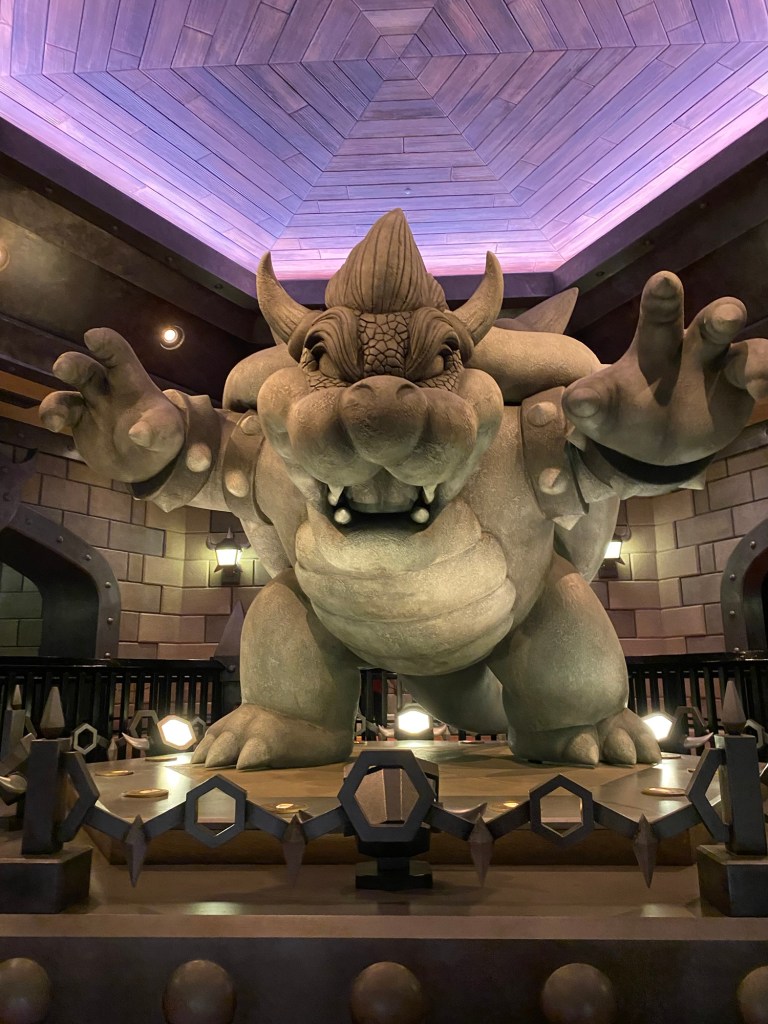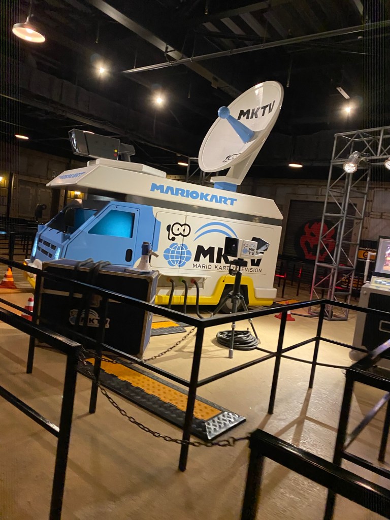 La deuxième attraction que nous avons adorée est Mario Kart ! C’était vraiment génial. Vous êtes dans un kart à quatre places, équipé d’un volant et d’une visière qui vous plonge en réalité augmentée. Ce que vous voyez, c’est une course Mario Kart filmée comme si vous étiez dans la voiture. Vous pouvez lancer des carapaces sur d’autres karts selon l’endroit où vous regardez. De plus, vous devez récupérer des pièces et en accumuler le plus possible. Nous n’avons presque pas attendu non plus, alors qu’il peut facilement y avoir deux heures de queue. Y aller tôt était donc une excellente idée !
