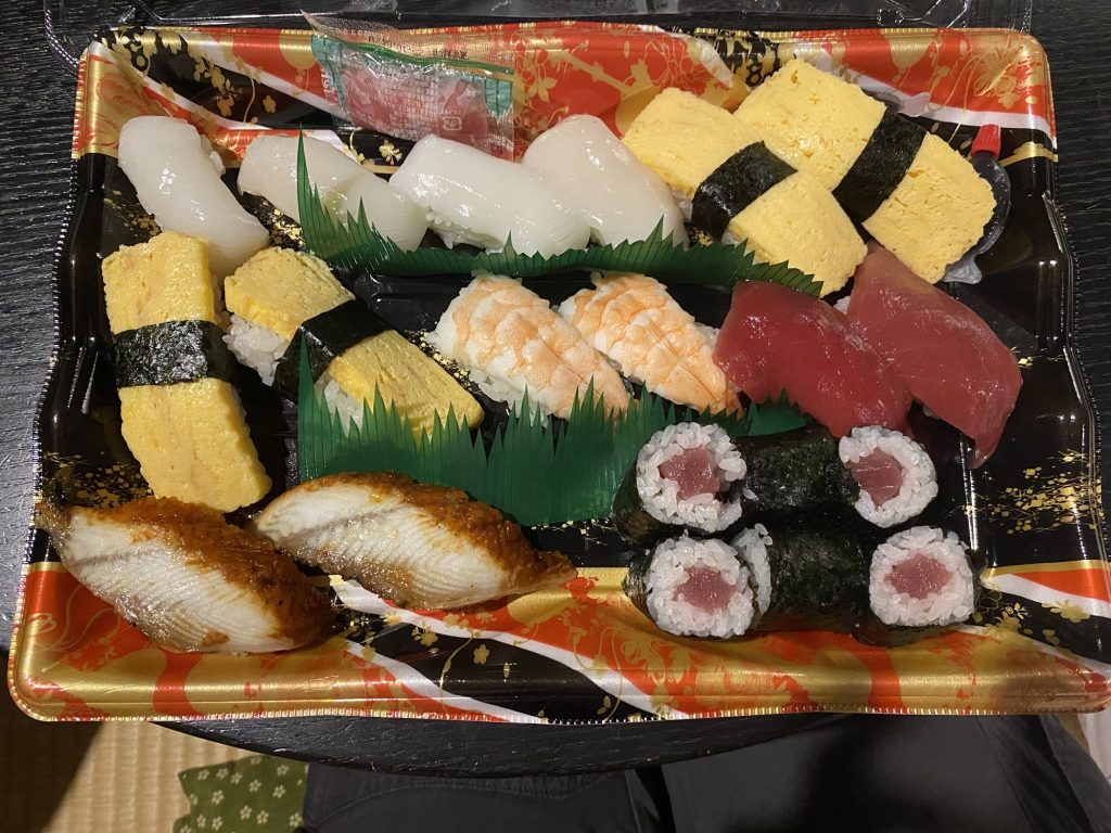 J’ai quand même réussi à trouver un restaurant de sushis qui ne prenait que des commandes à emporter. Les gars ont trouvé ça trop cher, du coup, ils ont fini au McDonald’s 🙄. En tout cas, moi j’ai très bien mangé avec tous mes petits sushis. J’en ai eu pour 1850 yens, soit environ 10 €, car j’ai pris un sushi au thon et un à l’anguille, ce qui est un peu plus cher.