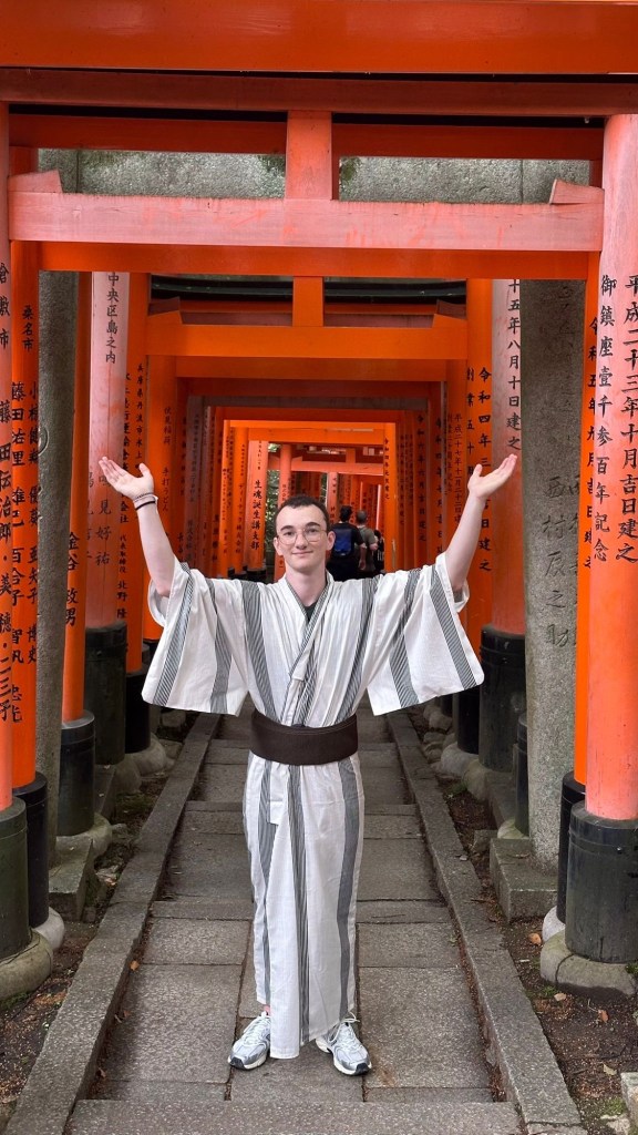 La journée a véritablement commencé en douceur à bord du train, qui nous a déposés directement au pied de l’impressionnant sanctuaire Fushimi Inari Taisha. Avant de nous lancer dans l’ascension et le passage par les milliers de torii (portiques vermillon), une escale s’imposait ! Nous avons fait un rapide crochet par un petit Lawson. C’était l’occasion parfaite de faire le plein : une bonne dose de café pour affronter la journée, une indispensable bouteille d’eau, et bien sûr, un délicieux melonpan, cette brioche japonaise légèrement sucrée et croustillante sur le dessus, un vrai régal pour le petit-déjeuner.