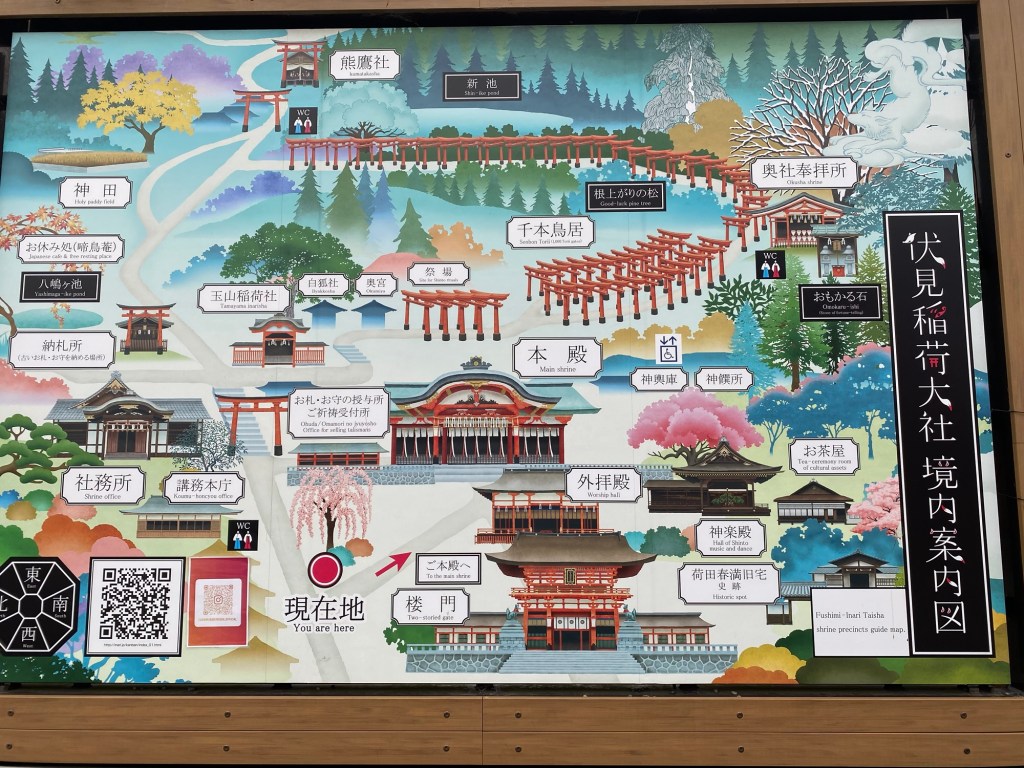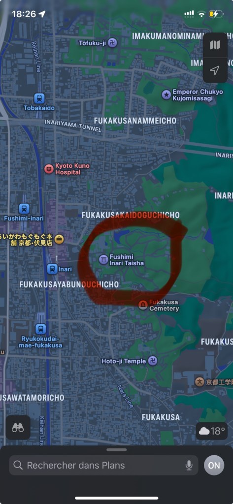 C’est grâce à cette carte (aussi trompeuse soit-elle !) que nous nous sommes dirigés vers le sommet du sanctuaire. J’ai oublié de préciser que Fushimi Inari Taisha est situé sur une grande colline à l’est de Kyoto. On s’apprêtait donc à une belle ascension !