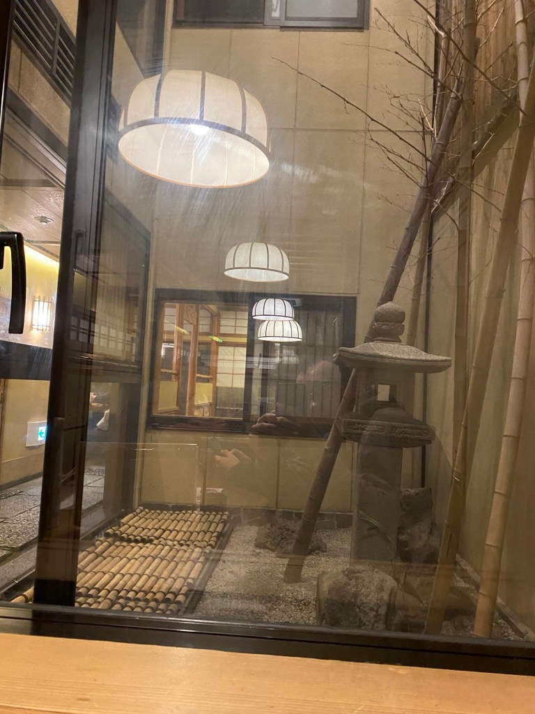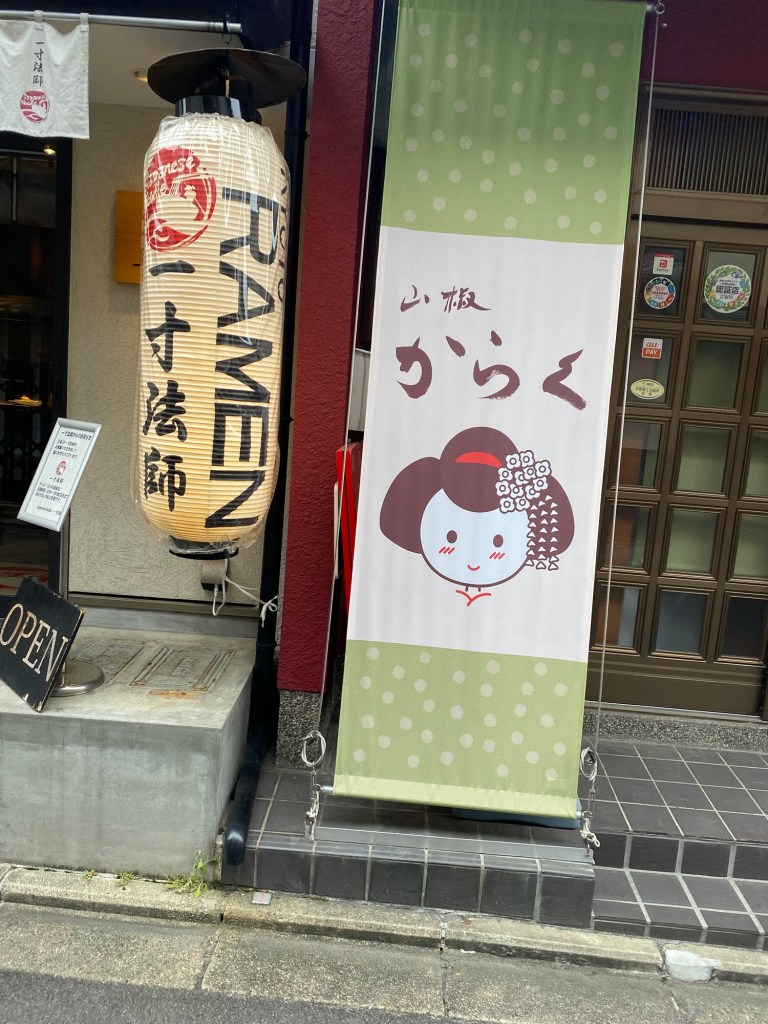 De l’extérieur, le restaurant était un peu caché : des tissus pendaient devant l’entrée et la porte était fermée. Mais en fait, il suffisait de pousser pour y entrer. C’est assez courant à Kyoto de trouver ce type d’établissements discrets, presque secrets, qui ne s’ouvrent qu’aux curieux. Une belle découverte !