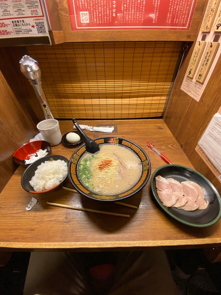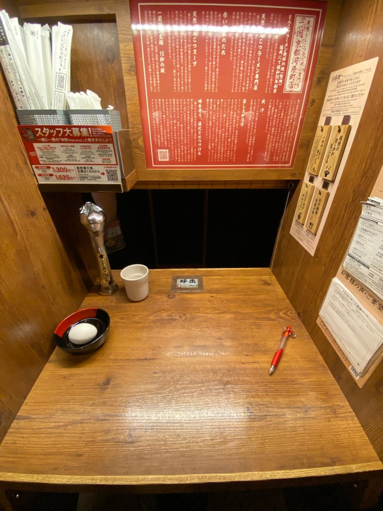 Leur système est assez particulier et très efficace : on commande sur une machine à l’entrée, puis on s’installe à une place libre. Chaque siège est en fait une petite case individuelle, séparée des autres par des cloisons. Devant nous, un petit volet permettait au personnel de nous servir sans que nous puissions les voir, ni eux nous voir. C’est vraiment ingénieux, surtout pour les personnes timides !