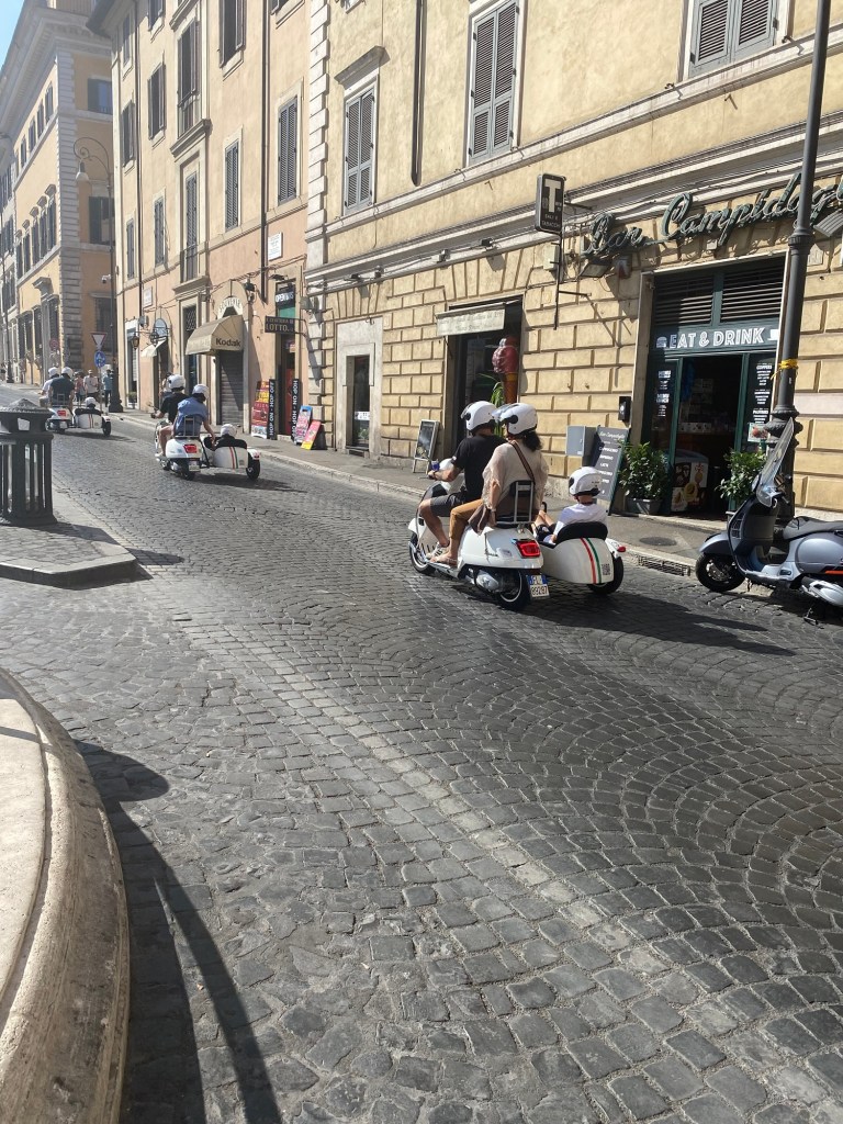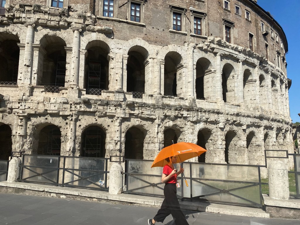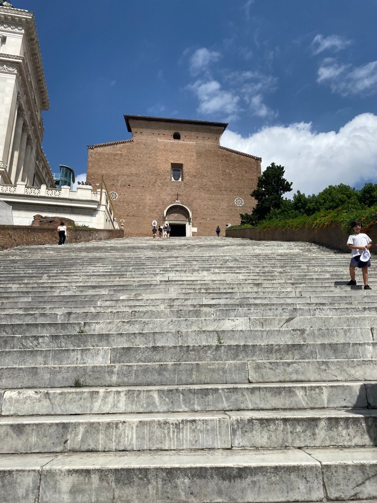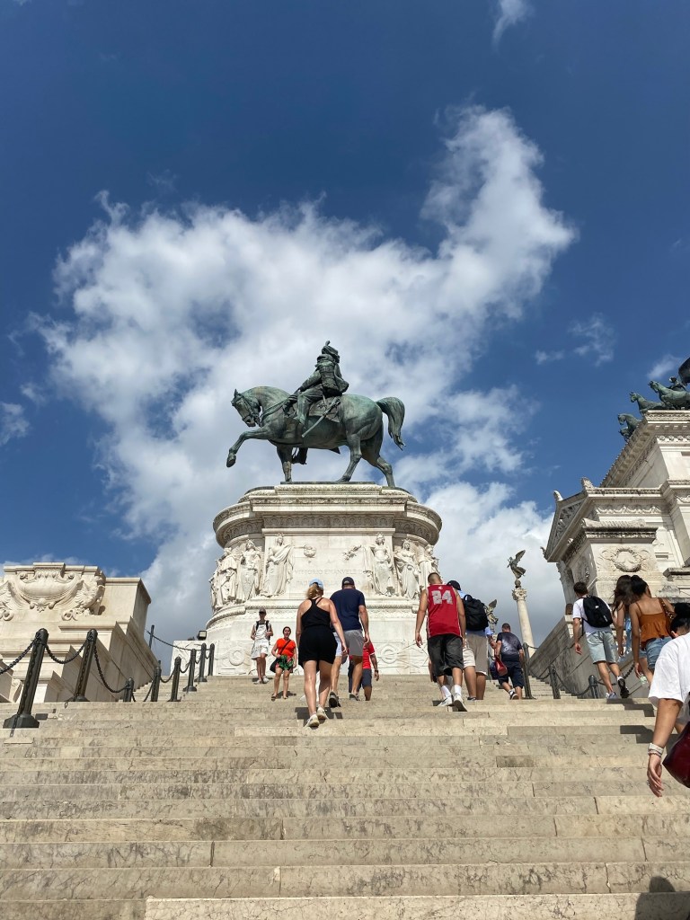 Une fois arrivés là-bas, on commence une petite promenade sous le beau soleil romain — qui tape fort, comme toujours 😅.