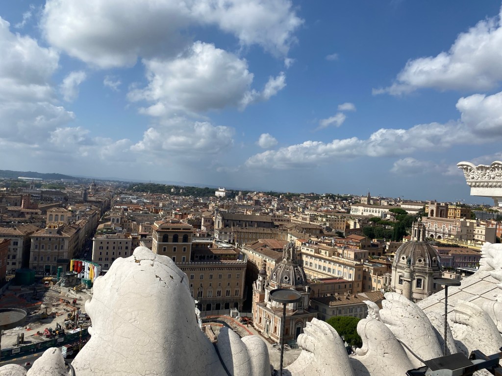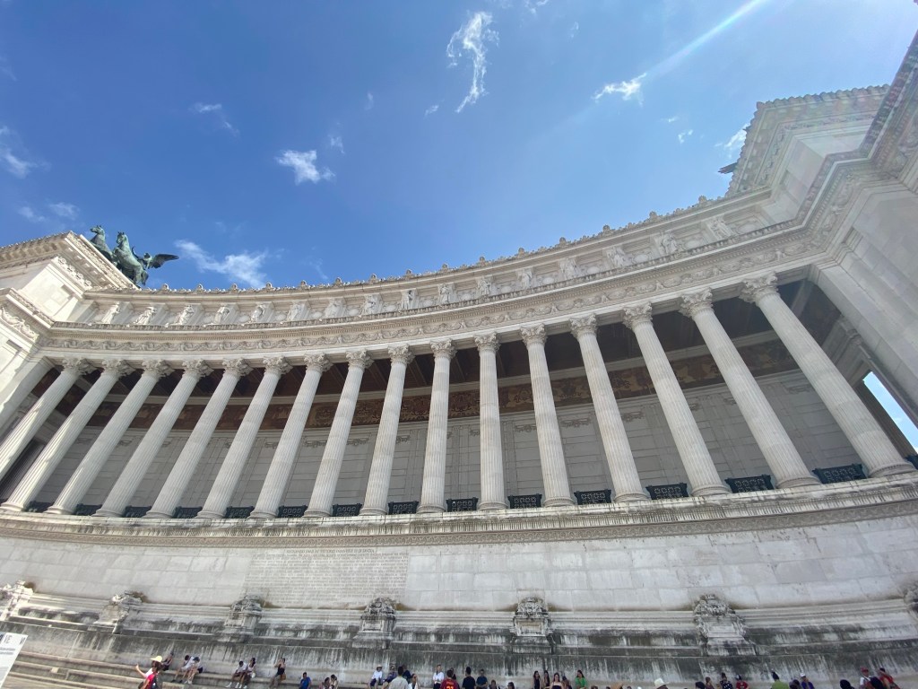 Après cette visite, nous sommes repartis en direction du centre de Rome pour aller visiter le monument Vittorio Emmanuel II, également surnommé l’Autel de la Patrie (Altare della Patria) ou encore la machine à écrire. Ce gigantesque édifice en marbre blanc est dédié au premier roi de l’Italie unifiée, Victor Emmanuel II, et il impressionne vraiment par sa taille et sa symétrie. On y trouve aussi la tombe du Soldat inconnu, gardée en permanence par des militaires.