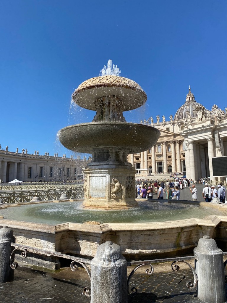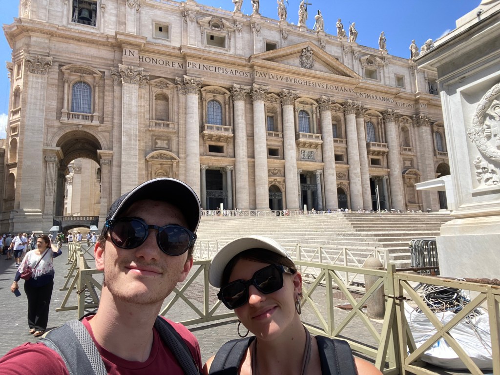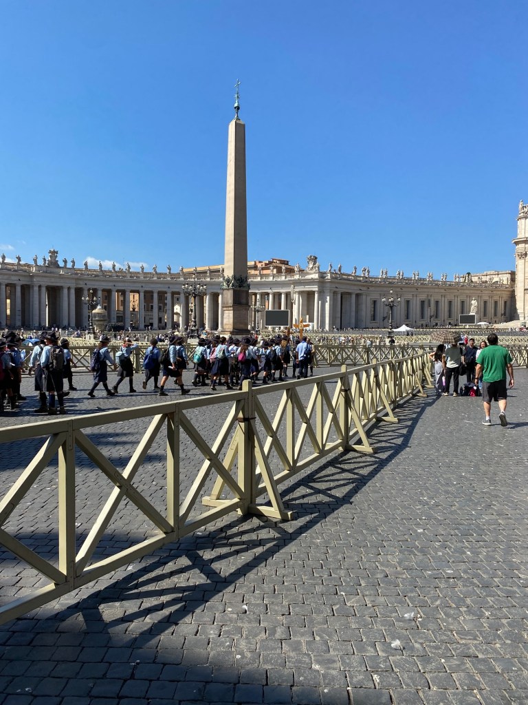 Une fois arrivés, nous passons les portiques de sécurité pour accéder à la célÚbre Place Saint-Pierre, située juste devant la basilique.