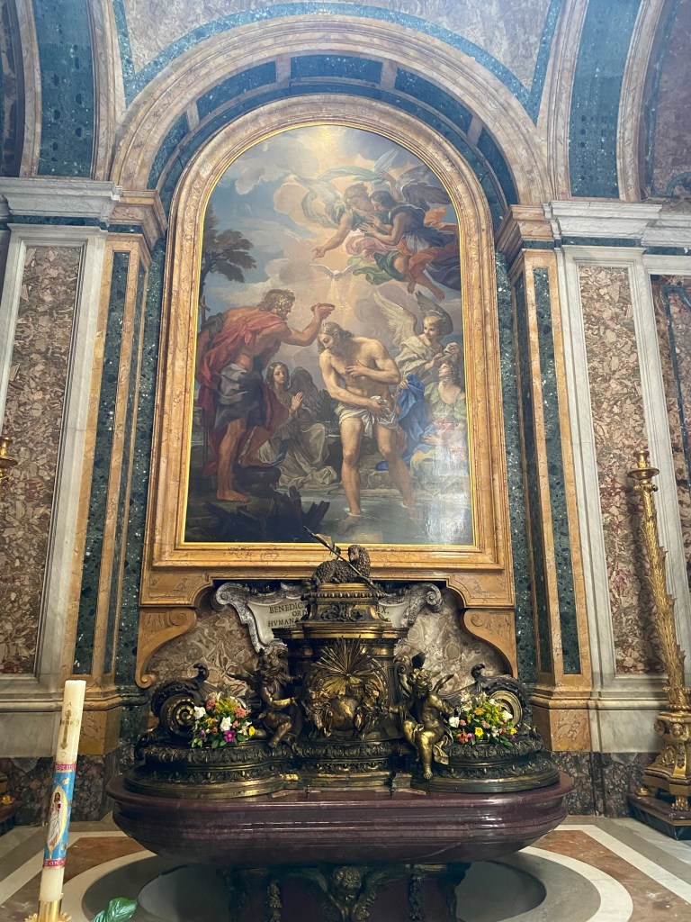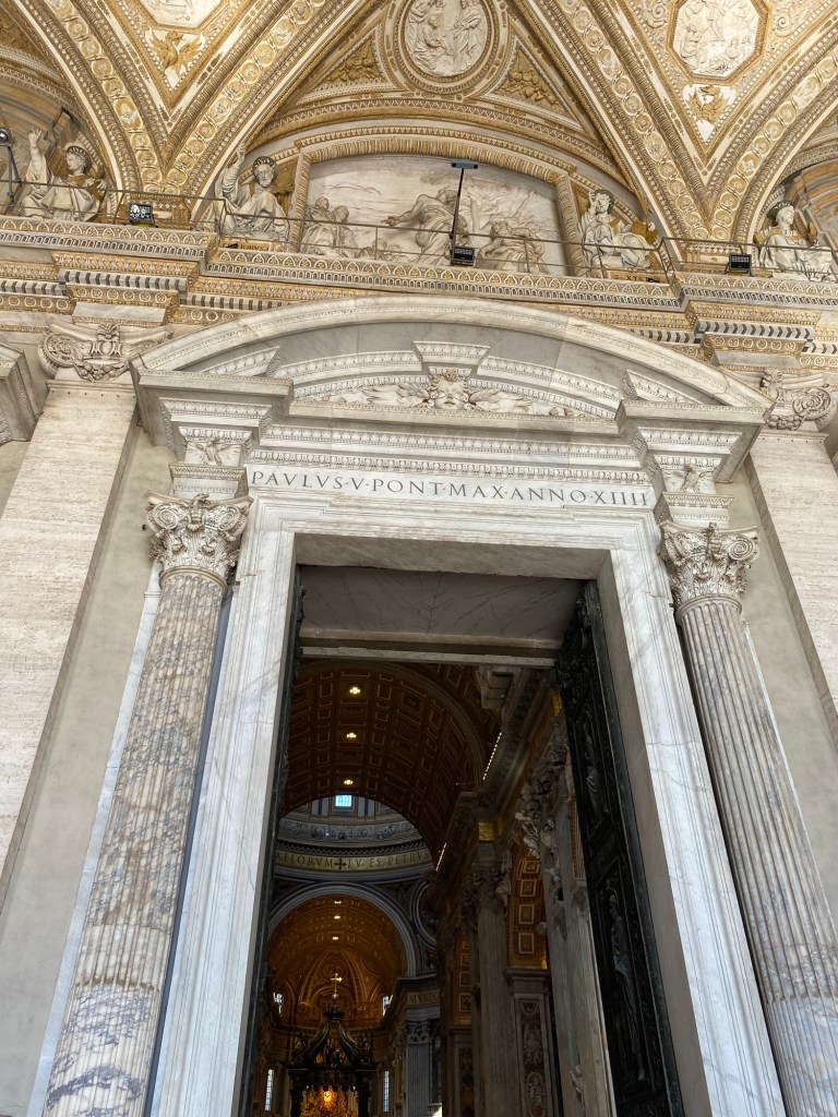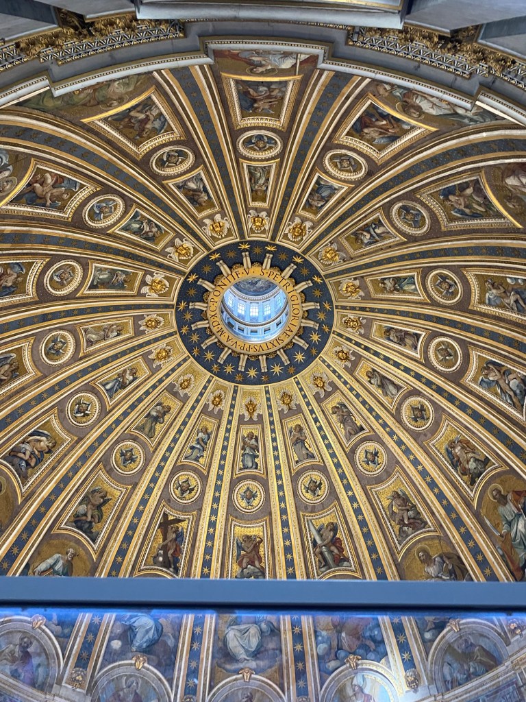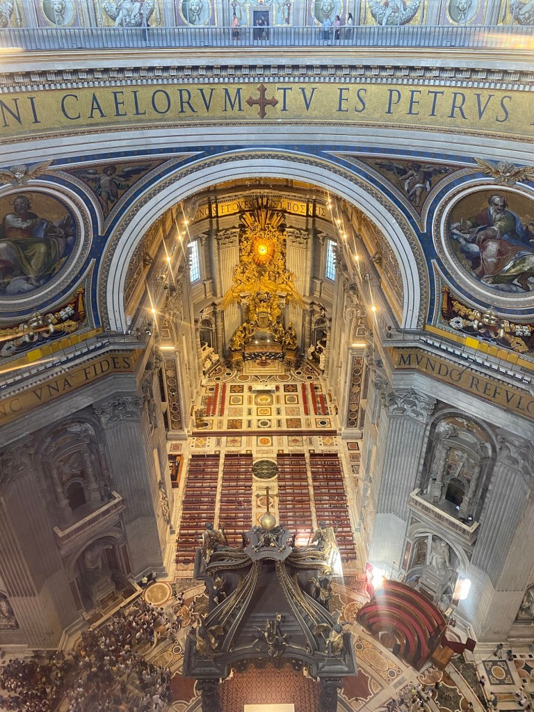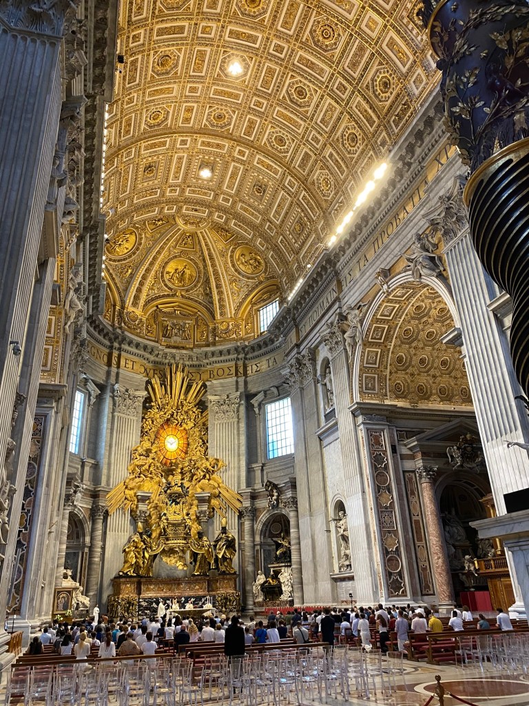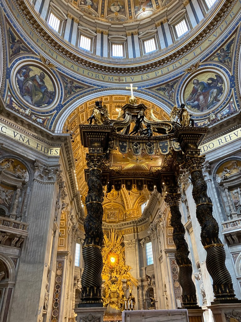 AprĂšs avoir patientĂ© un petit moment dans la file, nous entrons enfin dans la basilique Ă 10h30. DĂšs les premiers pas Ă lâintĂ©rieur, on est frappĂ© par les dimensions absolument gigantesques du lieu. La voĂ»te sâĂ©lĂšve Ă plus de 44 mĂštres de hauteur, ce qui donne une impression de grandeur presque irrĂ©elle. Tout autour de nous, les dorures scintillent sous la lumiĂšre filtrĂ©e, et chaque recoin est ornĂ© avec une richesse et un souci du dĂ©tail impressionnants. On comprend immĂ©diatement pourquoi la basilique Saint-Pierre est lâun des lieux les plus emblĂ©matiques du monde chrĂ©tien.
