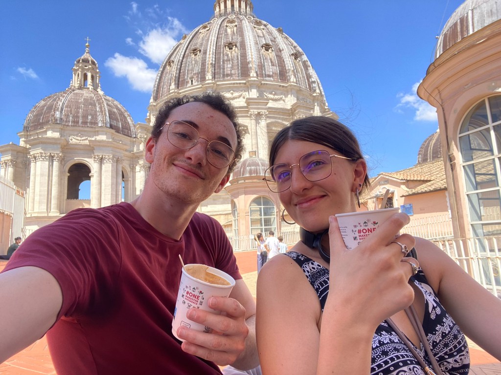 Câest assez insolite de boire un cafĂ© Ă cet endroit, avec la coupole dâun cĂŽtĂ© et la vue sur la place Saint-Pierre de lâautre. Un petit moment de pause bien mĂ©ritĂ© aprĂšs cette montĂ©e !