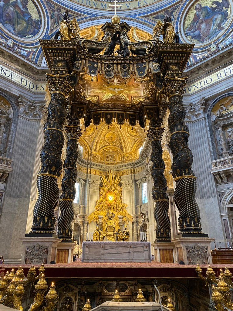 AprĂšs cela, nous sommes remontĂ©s dans la basilique pour admirer de plus prĂšs le cĂ©lĂšbre baldaquin de Saint-Pierre, situĂ© au centre exact de lâĂ©difice.